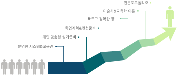 미술교육대학원 전문 수업과정을 통해 개인의 특성을 반영한 학업계획 설정과 그에 따른 교육대학원에서 요구하는 전문 포트폴리오를 효과적이며, 독창적으로 작품을 구성하며, 또한 교육대학원 전문적인 ‘이론공부’ 및 ‘면접 공부’도 함께 준비 한다.